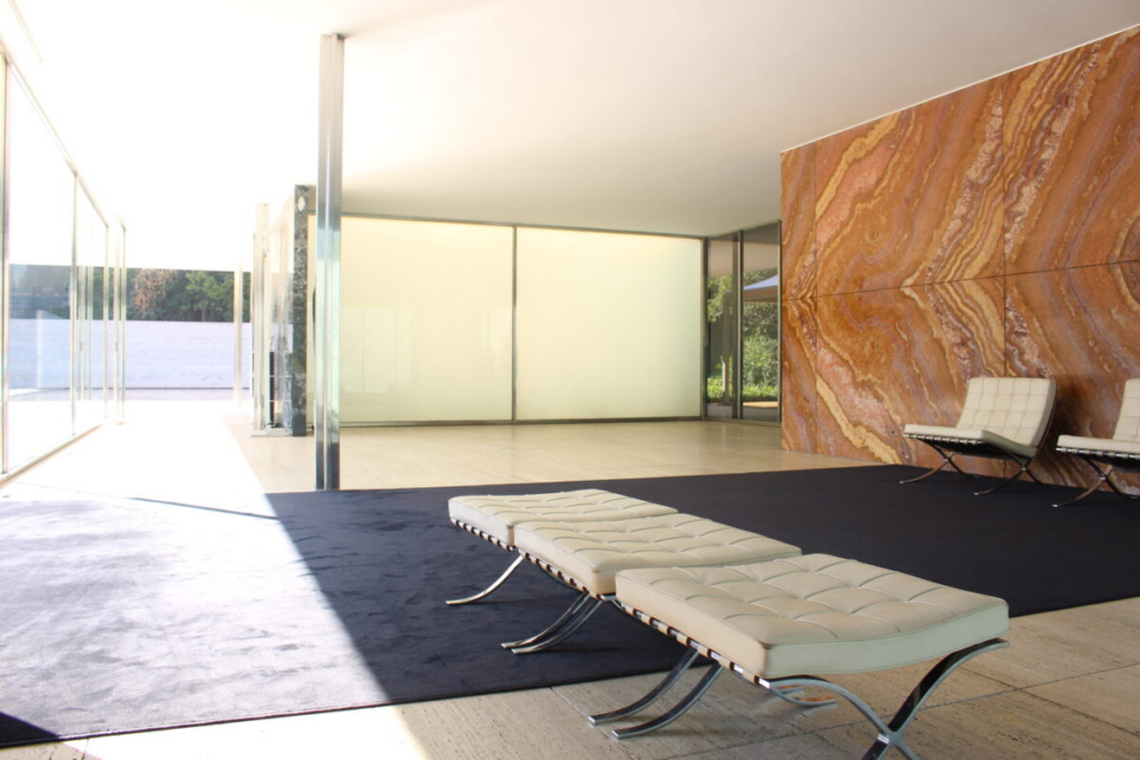 中に置かれているバルセロナ・チェアは、あとから選ばれた家具ではありません。この建築のためにつくられた、専用のイスです。座る場所まで含めて、空間がデザインされています。