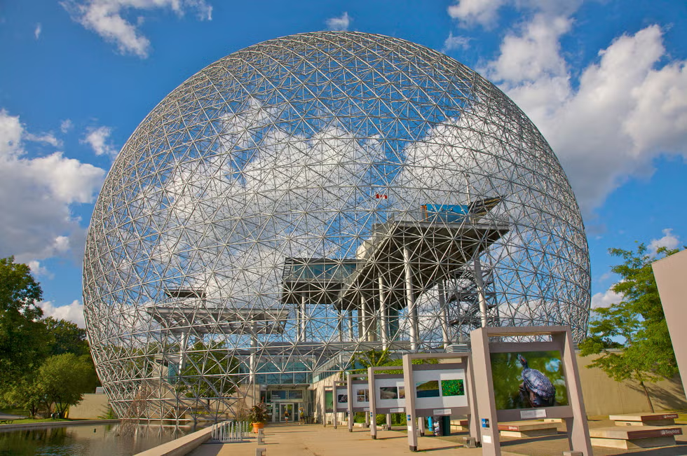 万博終了後、多くのパビリオンが解体される中、アメリカ館のドームは保存され、現在は「モントリオール・バイオスフィア」として環境博物館に再生されています。外皮は失われたものの、骨組みだけとなったドームは、構造美そのものを強調し、都市のランドマークとして機能し続けています。