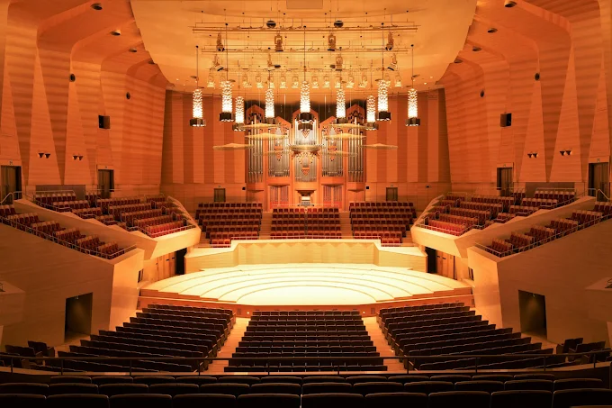 日本のサントリーホールは、残響時間が約2.1秒で、ぶどう畑型の座席配置による包み込むような音響が魅力です。