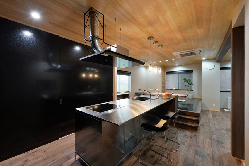 システムキッチンはフード部分までこだわったデザインを採用しています。大きなアイランドキッチンと冷蔵庫などの家電も、全て格納する背面収納で、キッチン全体を重厚でクリーンに魅せています。テーブル板は、ウォールナットの一枚板で製作しました。