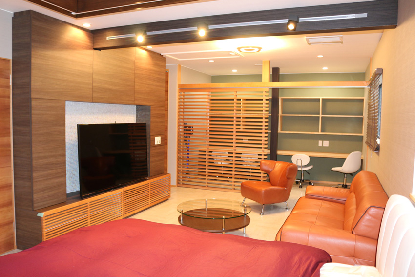 寝室には、テレビコーナー、奥には子ども達が仲良く勉強できるPCスペースを設けました。添え付けの棚と机により、空間を最大利用し、格子扉を引けば、また違った印象に変わります。