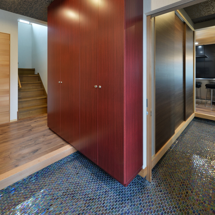 玄関を開けると、踏み心地の良いウォールナットの床材や、土間に敷かれたキラキラ輝くガラスタイルなど、モダンさのなかにも個性的な空間が広がります。土間から伸びやかなLDKへと繋がり、ゲストがスムーズに招かれるレイアウトになっています。