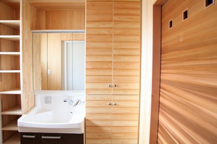 洗面脱衣所にも収納スペースを作りました。タオルでも洗剤でもたくさん入ります。