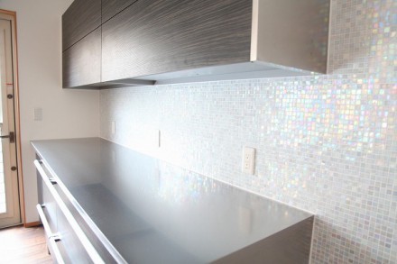 カップボード(水屋)の壁にはベネツィアンタイルを施し、オシャレで可愛らしい雰囲気に仕上げました。毎日のお料理が楽しみになりそうです。