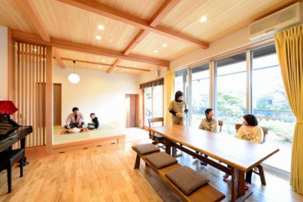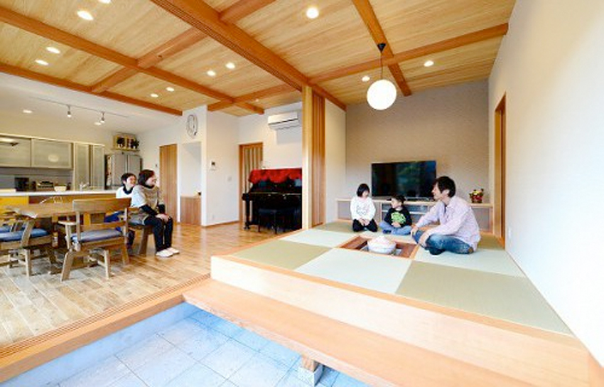 小上がりのある畳コーナーと繋がるLDK。畳コーナーには、半畳の畳を開けると囲炉裏が登場します。