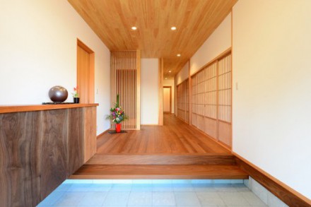 約8帖程の広い玄関は、しゃく谷石の三和土(たたき)と、床にはチークを使用した美しい玄関となっております。