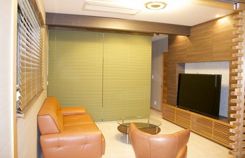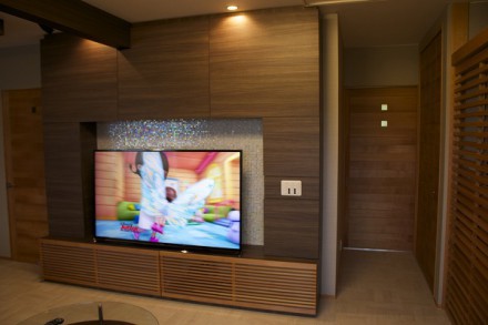 テレビの裏の壁にはタイルを貼り、光の入り方で色味が変わってきます。